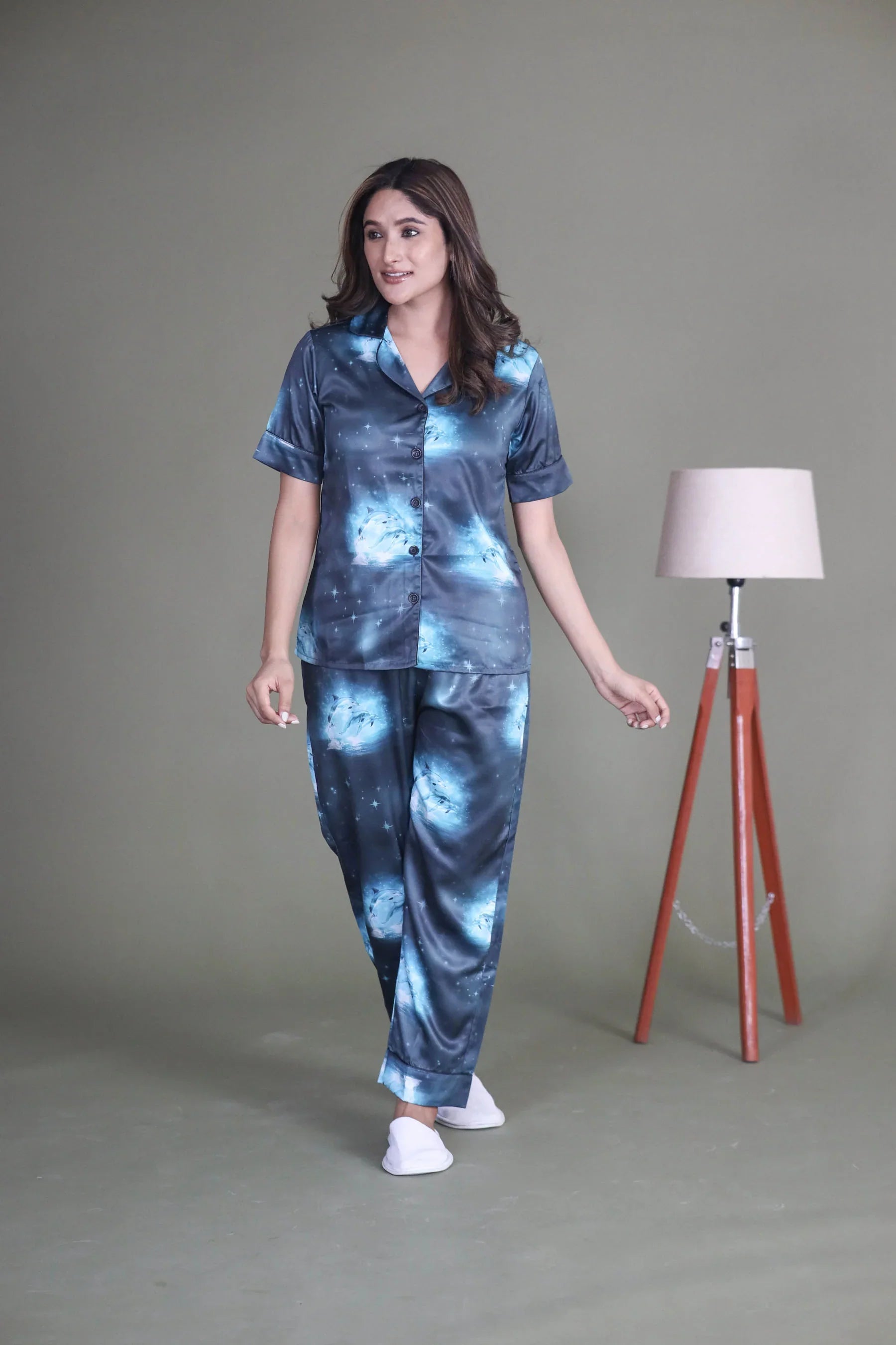 Night Wear Satin Blue Color Dolphin Print Night Suit