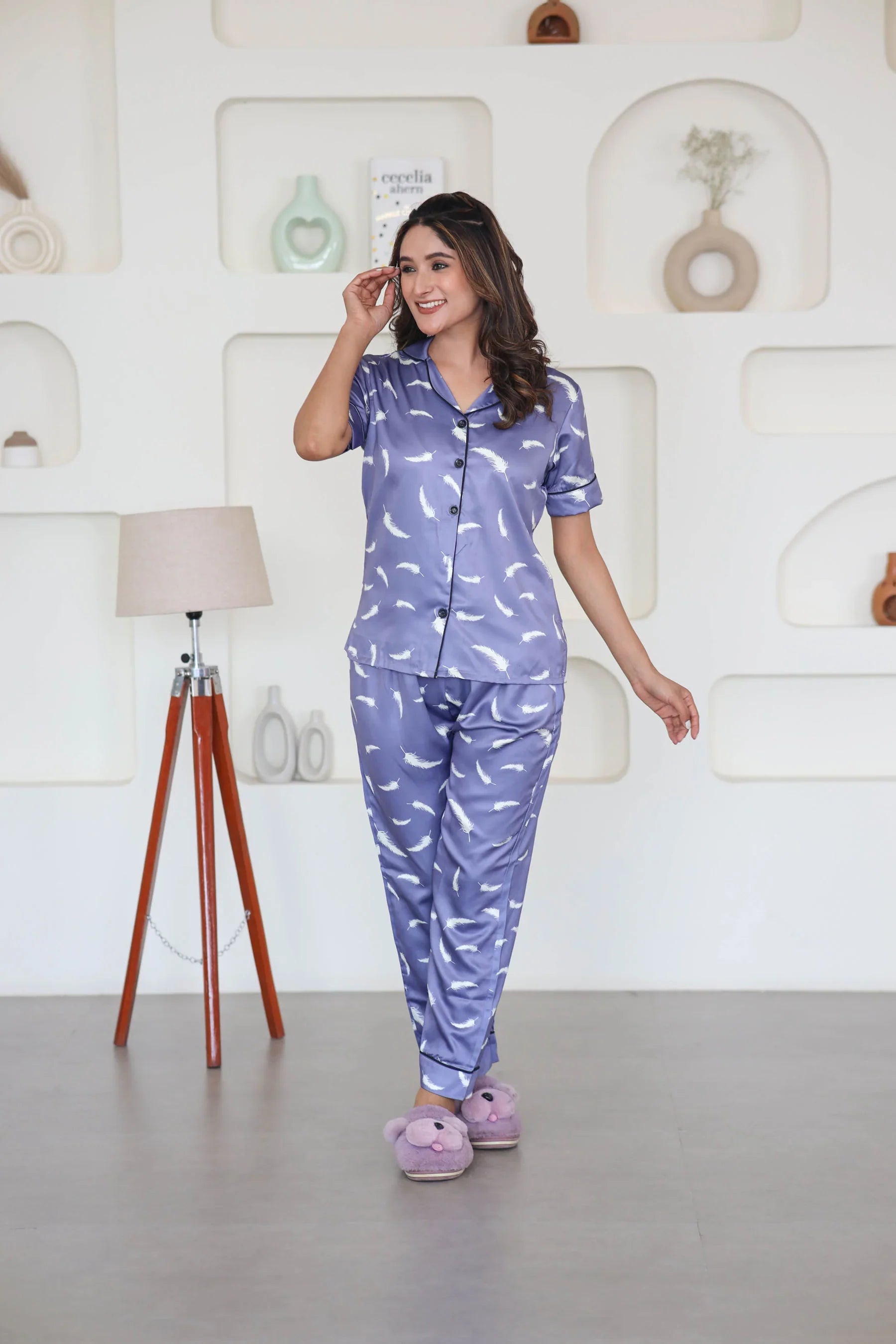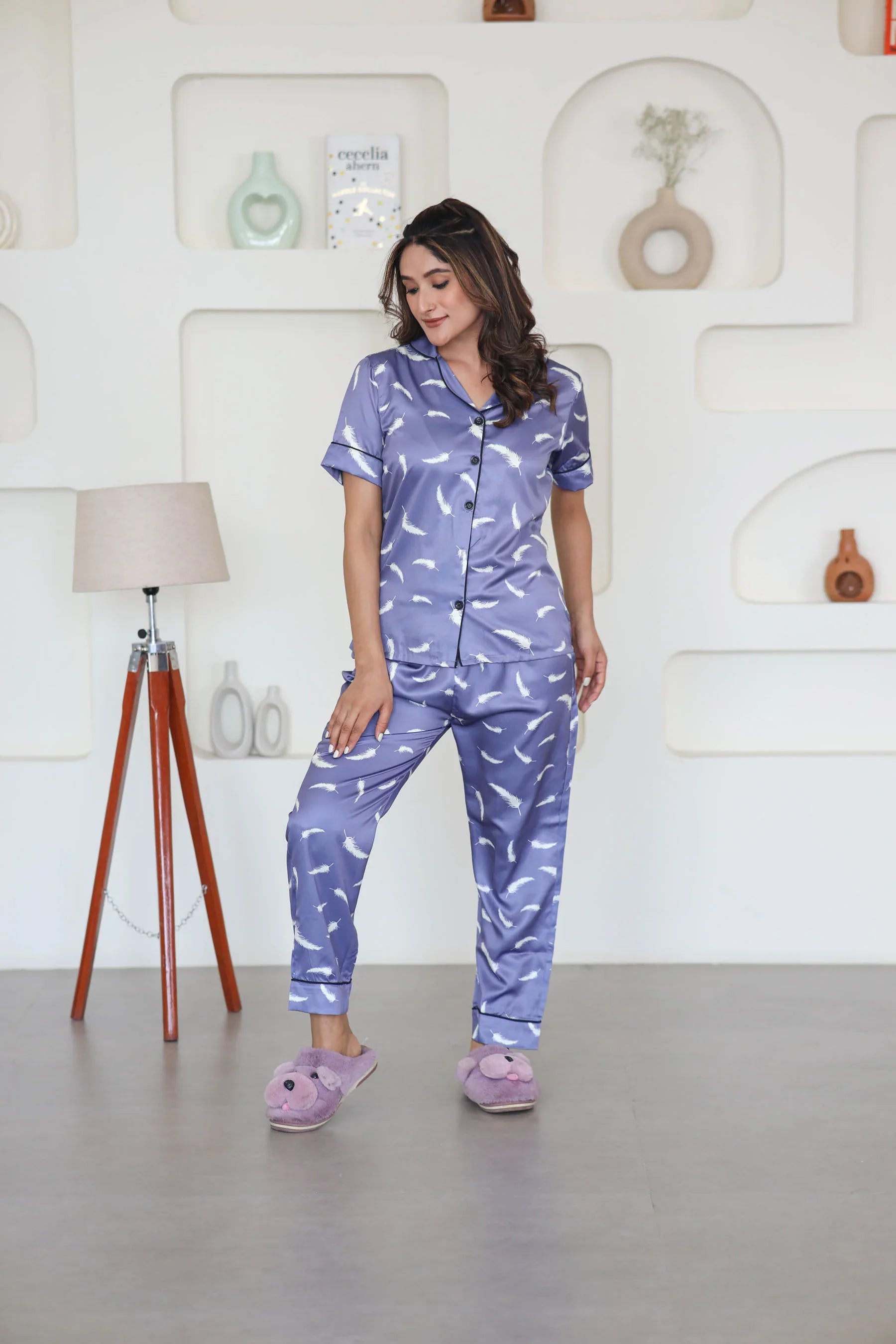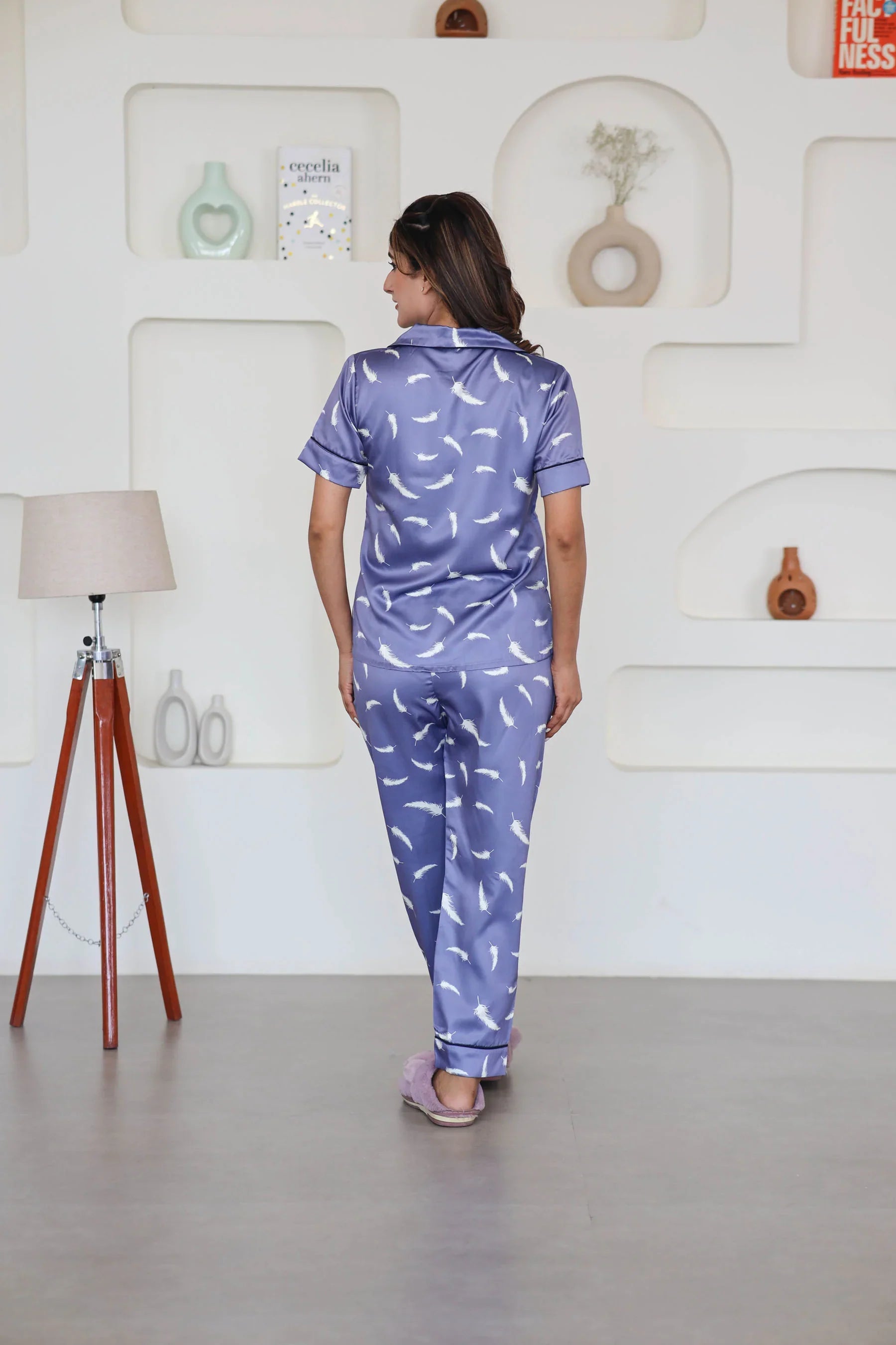 Night Wear Satin Lavender Color Feather Print Night Suit