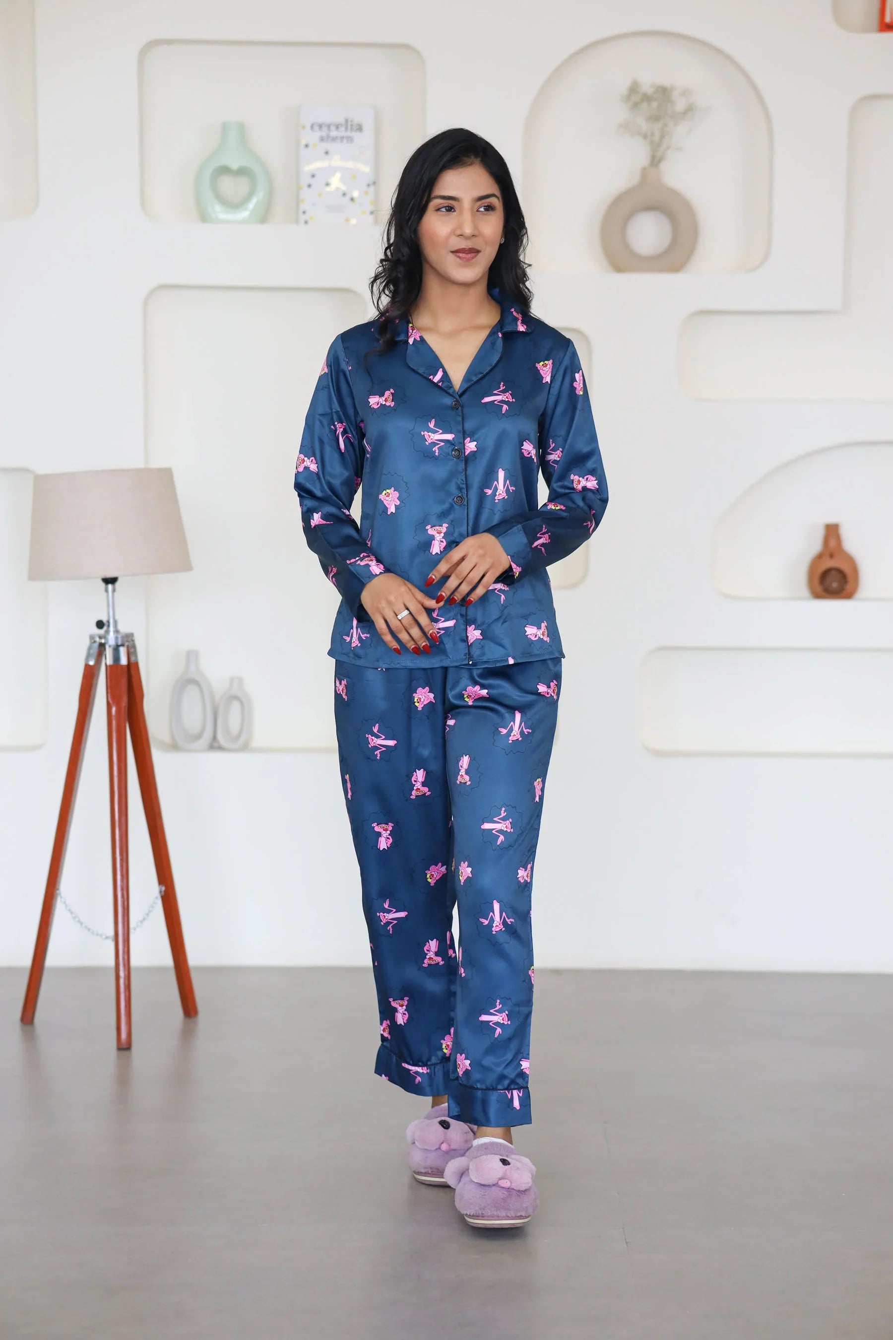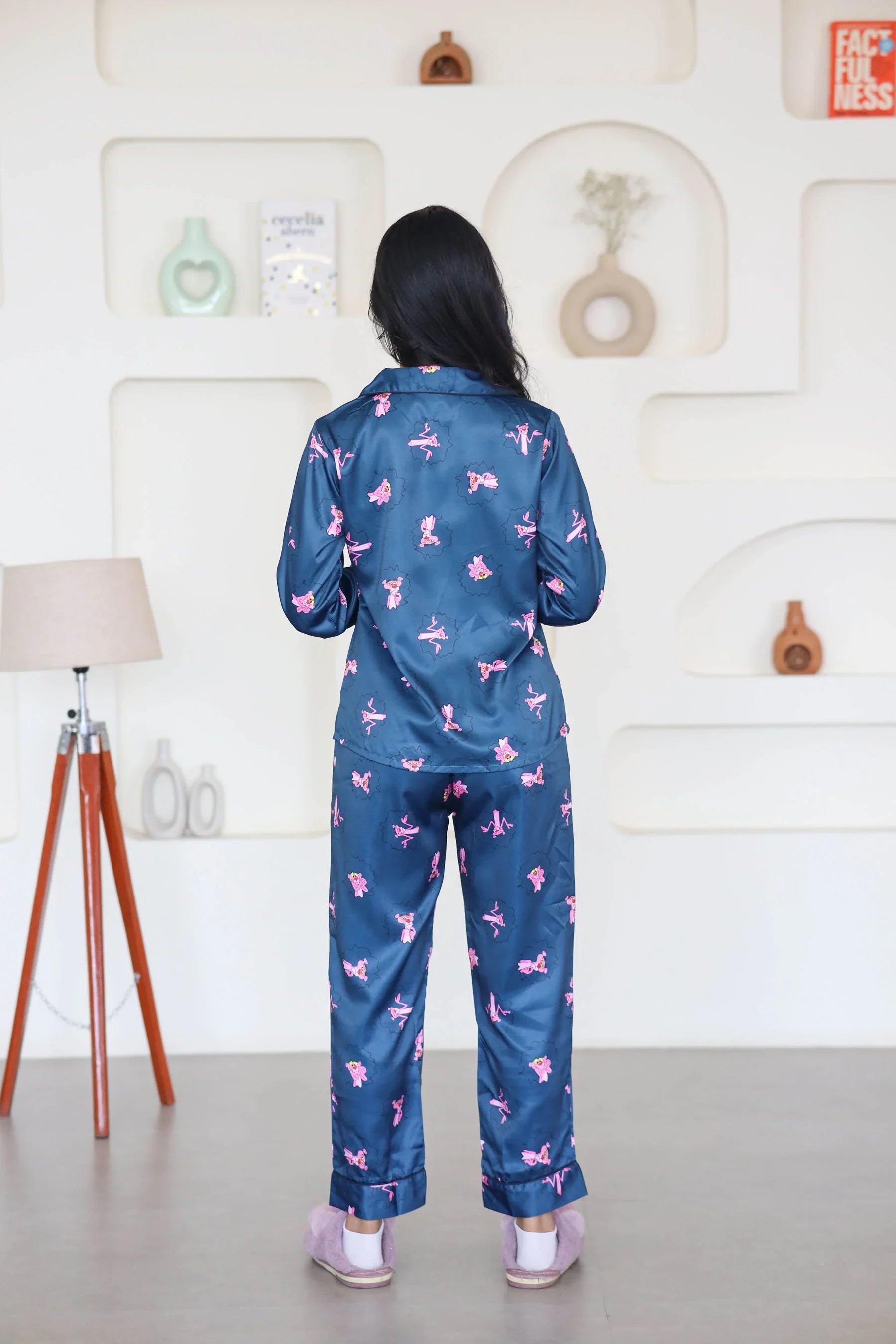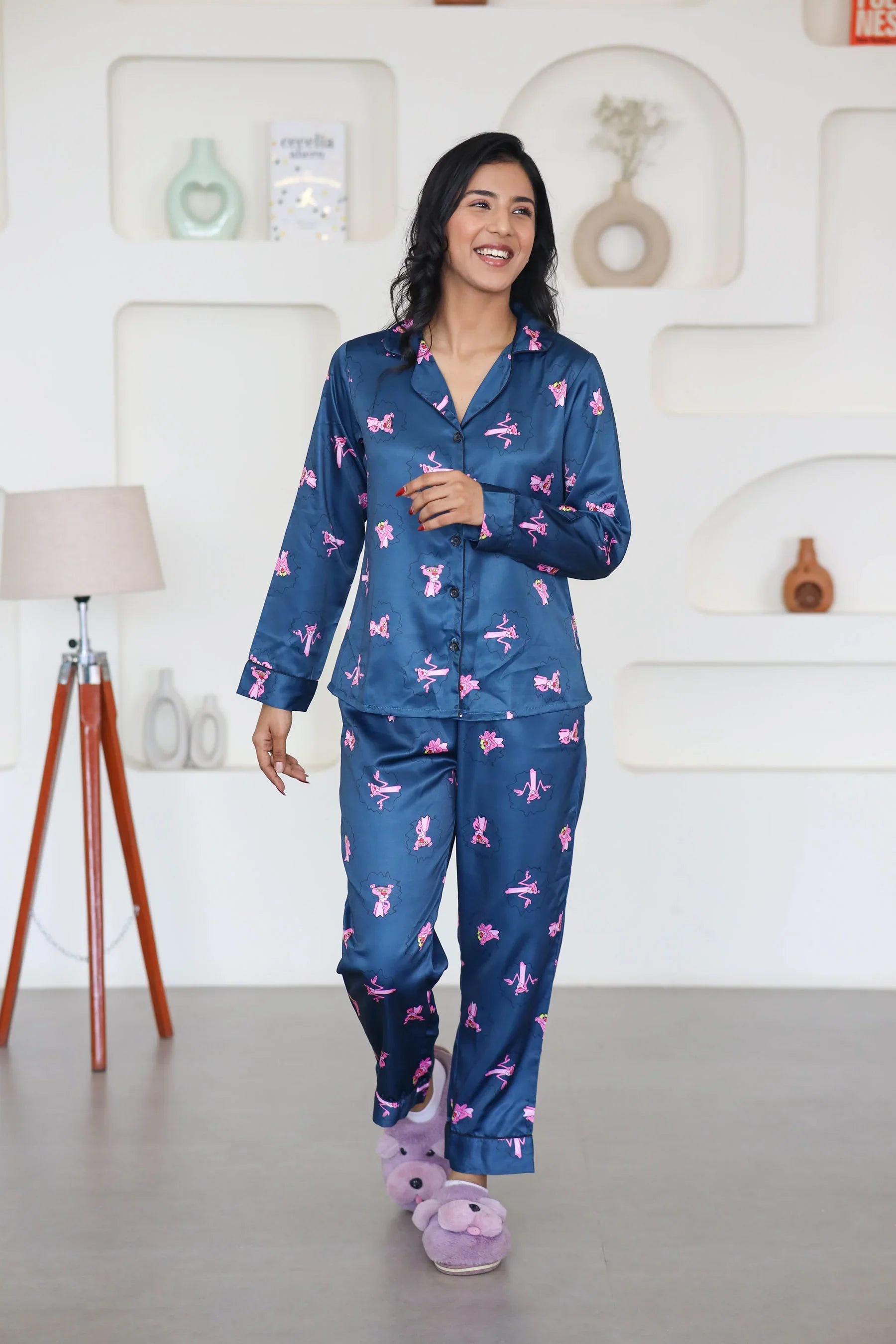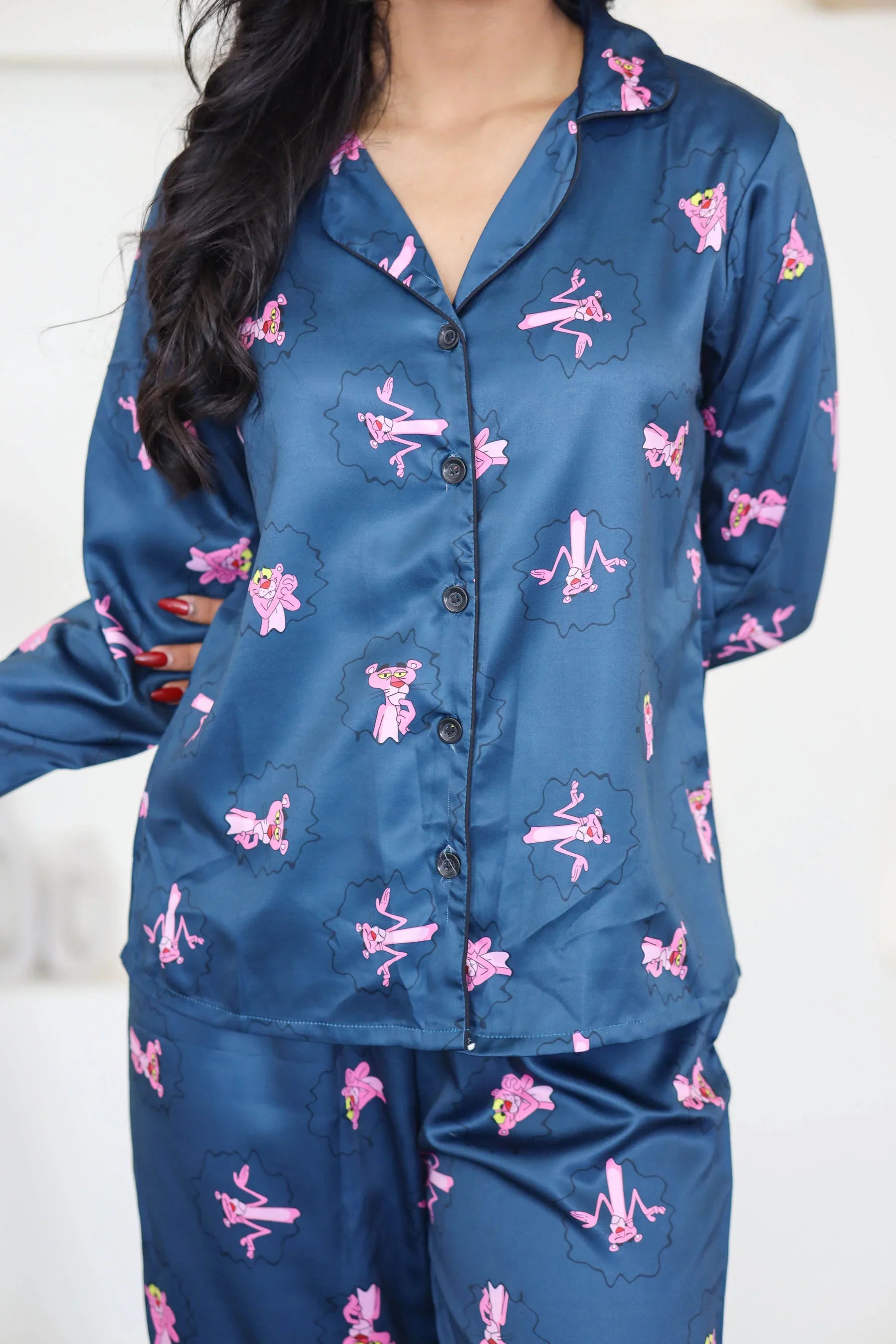 Night Wear Satin Teal Blue Color Pink Panther Print Night Suit