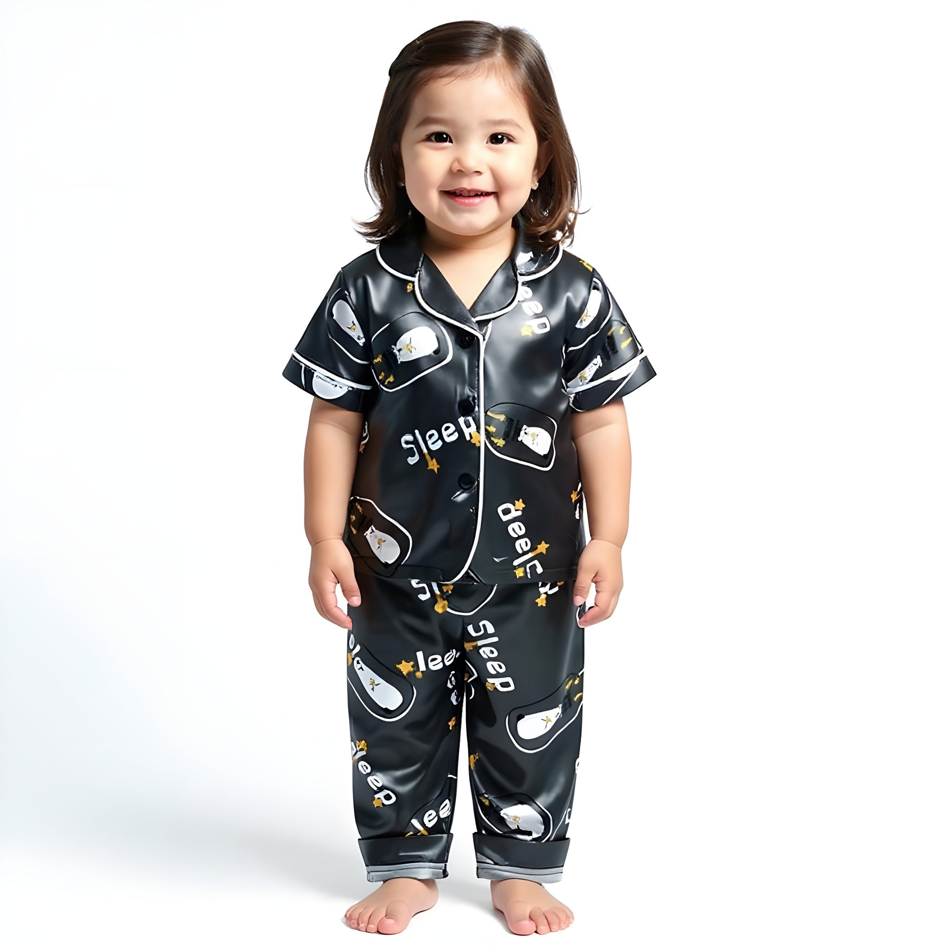Printed Blue Black Satin Co-ord Set for Boys and Girls